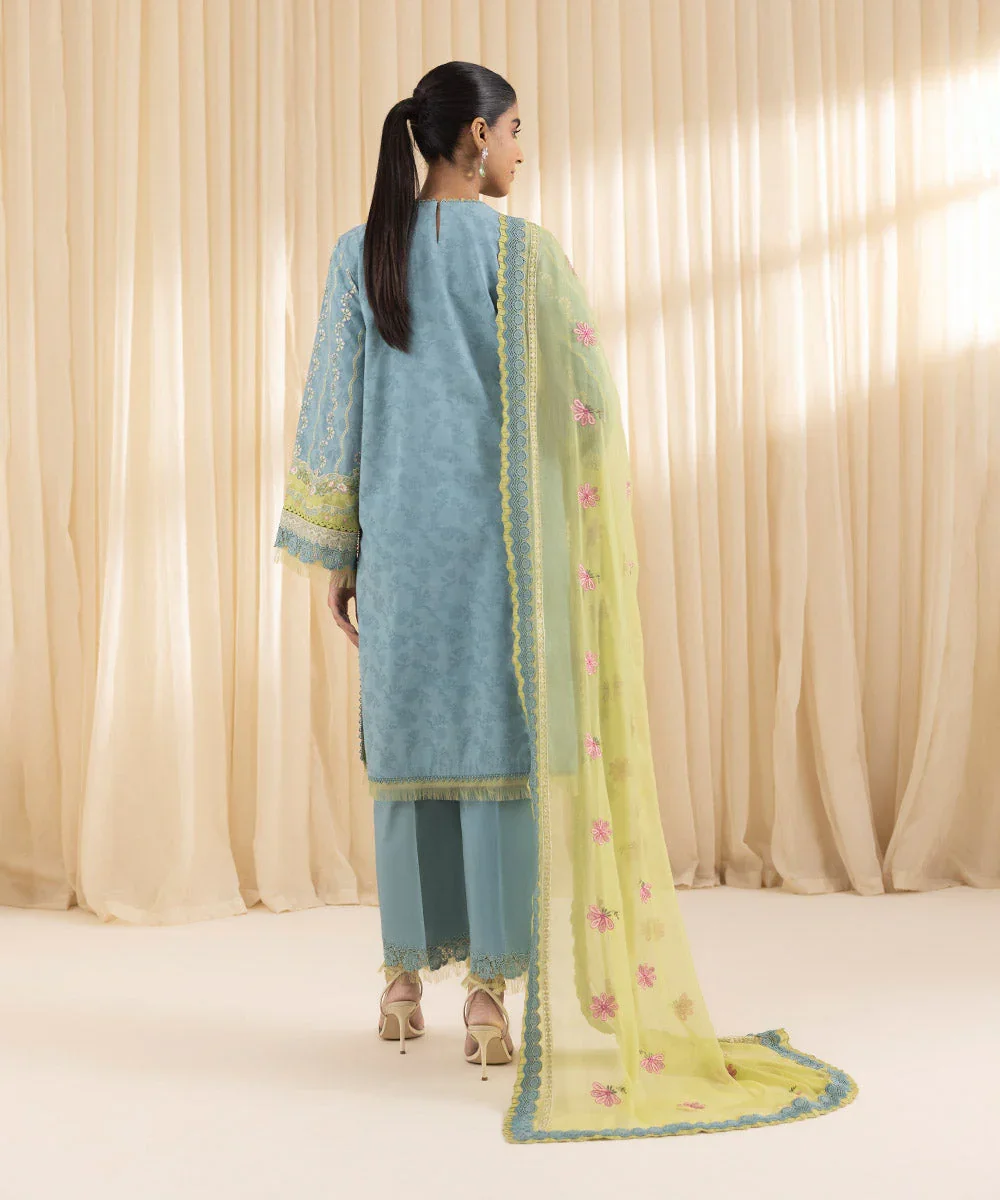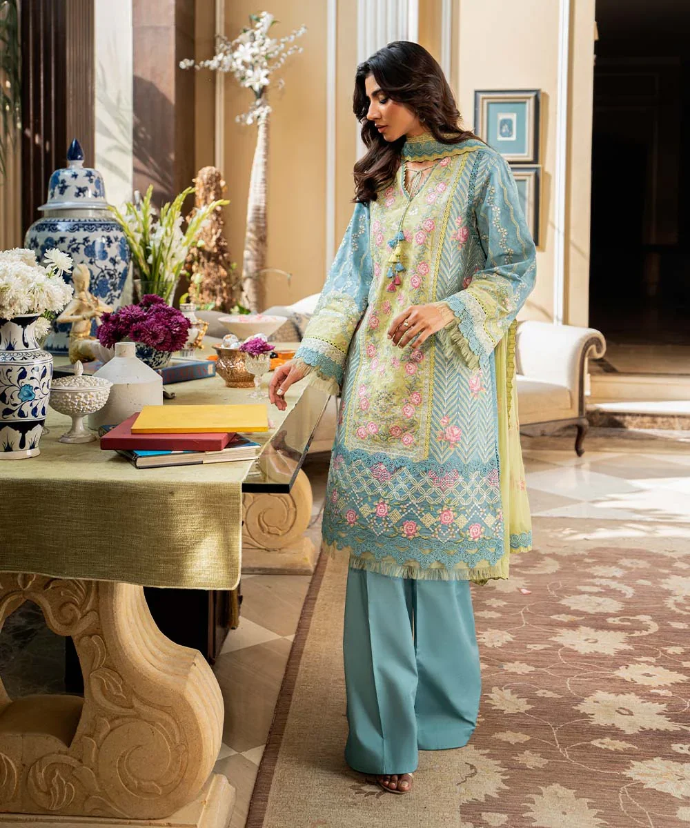 Elevate your wardrobe with this elegant three-piece embroidered suit, featuring a beautifully detailed aqua dobby shirt. The look is completed with a vibrant parrot green crinkle chiffon dupatta and comfortable cotton trousers, creating a perfect balance of sophistication, color, and everyday comfort.