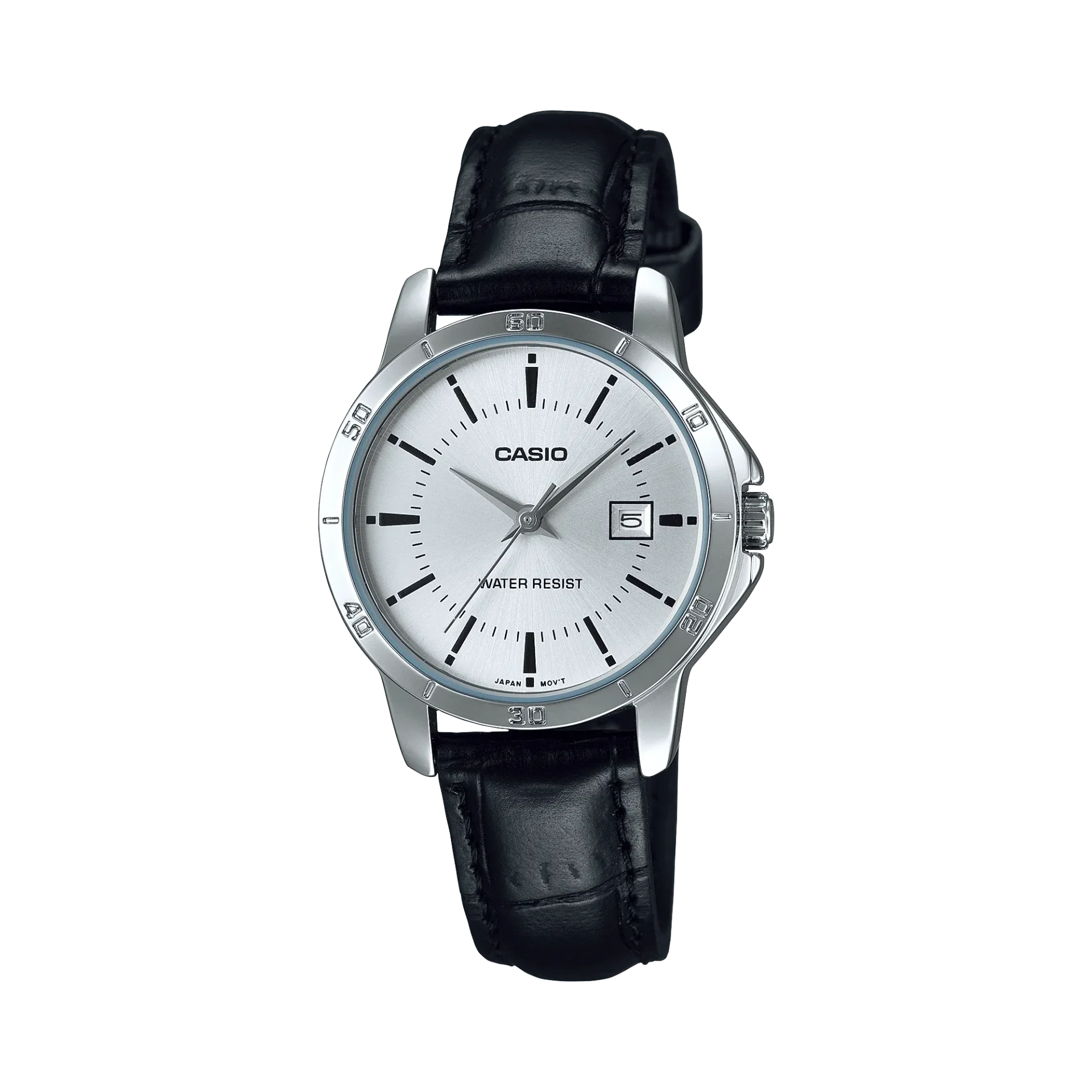Elevate your everyday look with the Casio LTP-V004L-7AUDF women’s analog watch, designed for timeless elegance and reliable performance. Featuring a clean white dial with classic hour markers and a sleek genuine leather strap, this watch blends simplicity with sophistication. Perfect for daily wear or formal occasions, it offers precision quartz movement, durable construction, and long-lasting comfort — a true essential for modern women who value style and quality.